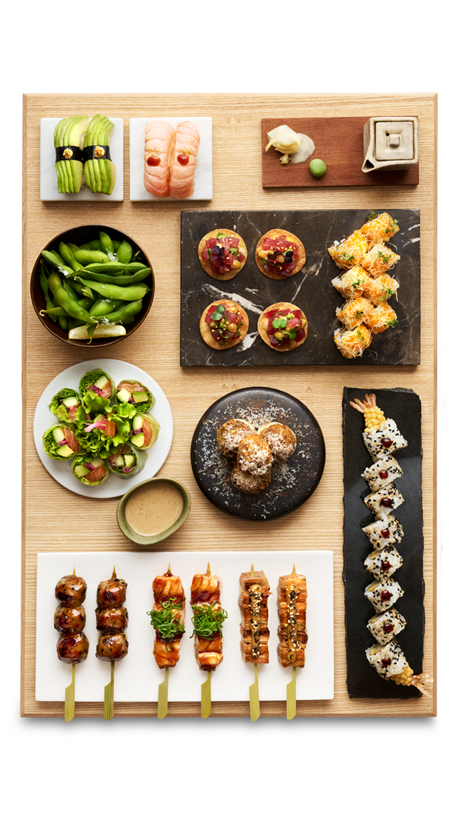 Edamame beans with sea salt & lemon Tuna Tartare Bites with tuna, avocado, sesame, miso, yuzu and spring onion on crispy flat bread Kinoko Korokke Mushroom croquette, Danish Rød Krystal cheese, miso aïoli & truffle dust Rice Paper Shake with soy-cured salmon, pickled red onion, avocado, cucumber & coriander served with goma Nigiri with seared salmon Nigiri with avocado, yuzu-kosho & soya sesame Crispy Ebi maki with tempura shrimp, avocado, spicy sauce & tsume soya Spicy Tuna maki with tuna, cucumber, spicy sauce, masago, kataifi & cress Tsukune sticks with chicken meatballs & teriyaki Buta Yaki sticks with free-range pork with yuzu-miso Shake Teriyaki sticks with salmon, teriyaki & spring onion