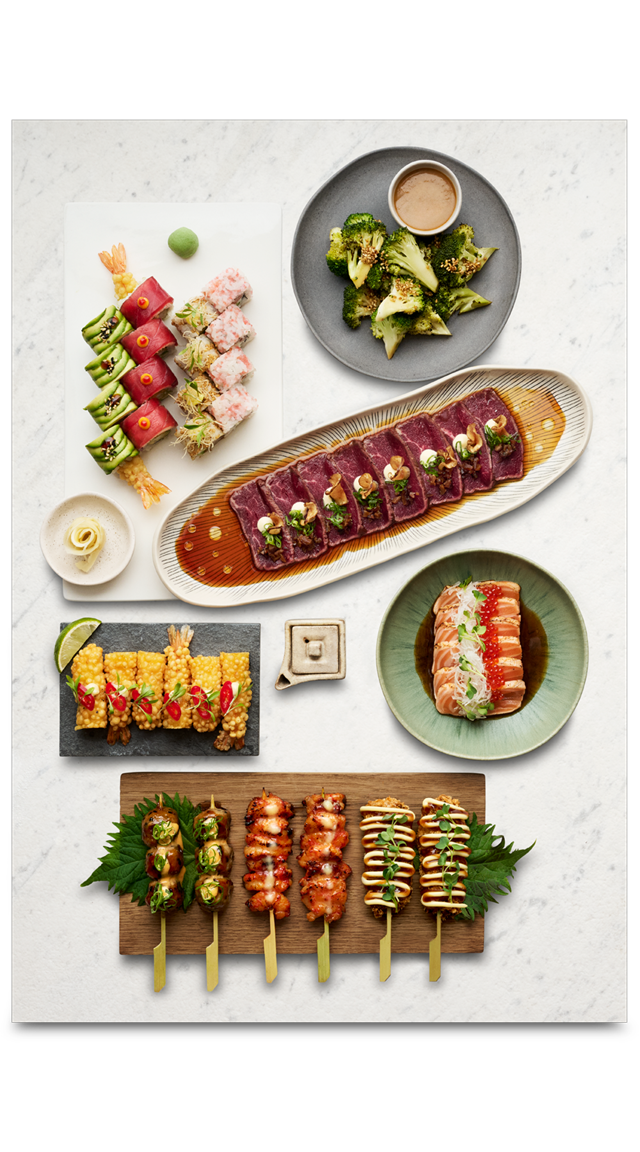 Broccoli. Grilled in supreme soy, served with spicy goma Ebi Bites. Tempura shrimp, miso aïoli, chilli, lime & coriander Shake Tataki. Salmon, sake-tamari marinated trout roe, daikon, miso, ponzu & daikon cress Beef Tataki. Beef fillet with miso aïoli, spring onion, artichoke chips, shiitake & truffle ponzu Ebi Panko. Tempura shrimp & spicy sauce, topped with avocado Hell’s Kitchen. Tempura shrimp, avocado & spicy sauce, topped with tuna & barbecue Pink Alaska. Salmon, avocado, cream cheese & lumpfish roe Nanban. Chicken, avocado, kataifi, coriander & spicy yuzu-kosho Aka Ebi. Argentinian red shrimp, spicy gochujang & garlic butter Tsukune Chilli. Chicken meatballs, chilli dip, teriyaki & spring onions Gyu Katzu. Fried beef fillet, okonomiyaki sauce, Japanese mayonnaise, daikon cress